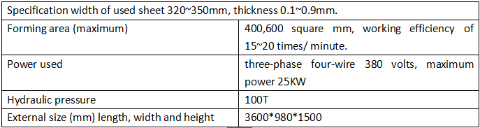 Traying nursery tray nggawe parameter teknis mesin Spesifikasi spektif saka lembaran sing digunakake: 300 ~ 320mm, kekandelan: 0,8 ~ 2mm. Wilayah (maksimal): 400 * 600 mm, efisiensi kerja 15 ~ 20 kali / menit. Daya sing digunakake: Telung phase papat kawat 380 volt, daya maksimum 25kW Meksa hidraulik: 100t Ukuran eksternal (MM) dawa, jembar lan dhuwur) 3600mm * 980mm * 1500mm