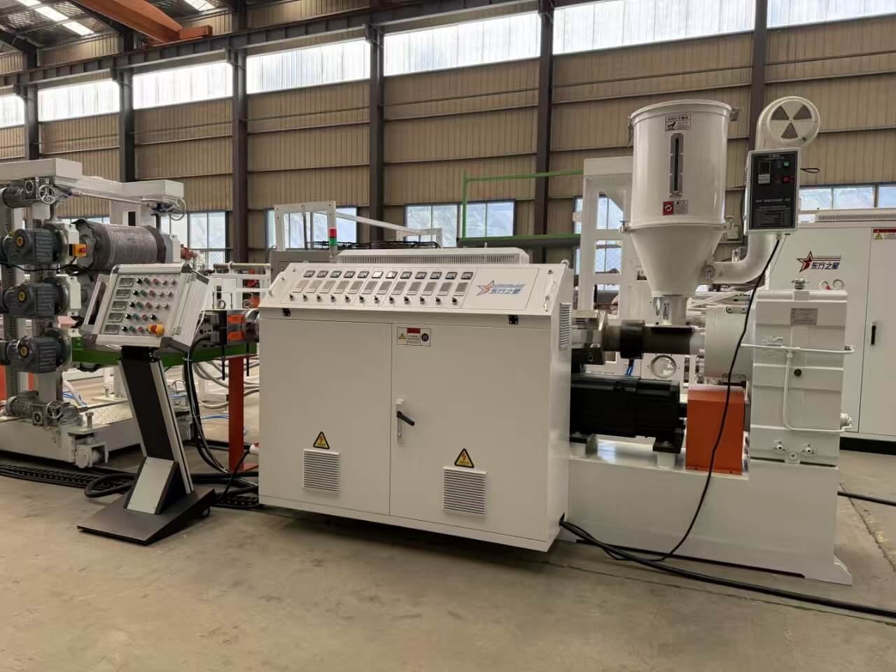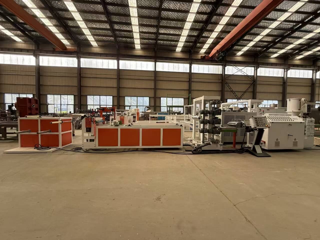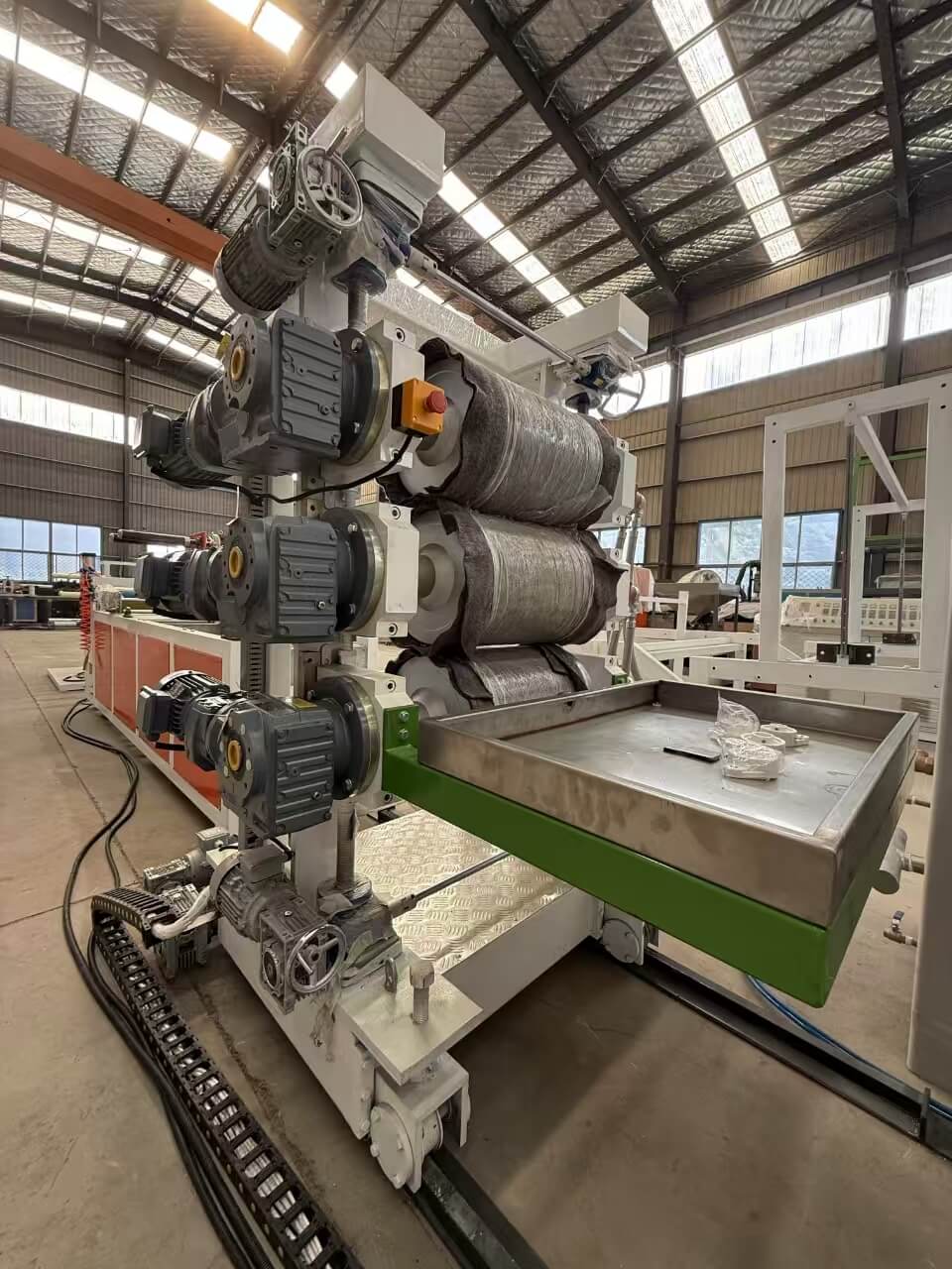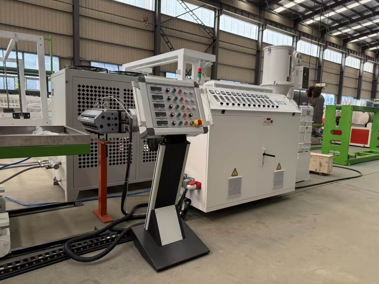 Garis ekstrusi TPU / PP / PP / PS-300 sudhut dirancang kanggo ngolah pelet utawa campuran remuk TPU, PE, PP, lan PS. Kanthi kapasitas produksi ** 60-100 kg / h **, baris kalebu komponen saka merek sing unggul kaya Siemens lan Omron. Iki nampilake lembaran 0.8-3mm mati, mesin calender telung-gulung, lan mesin nduwurke tumpukan, njamin output sing bermutu tinggi. Perlengkapan kasebut cocog karo standar kualitas lan kalebu dokumentasi teknis sing komprehensif kanggo gampang operasi lan pangopènan.